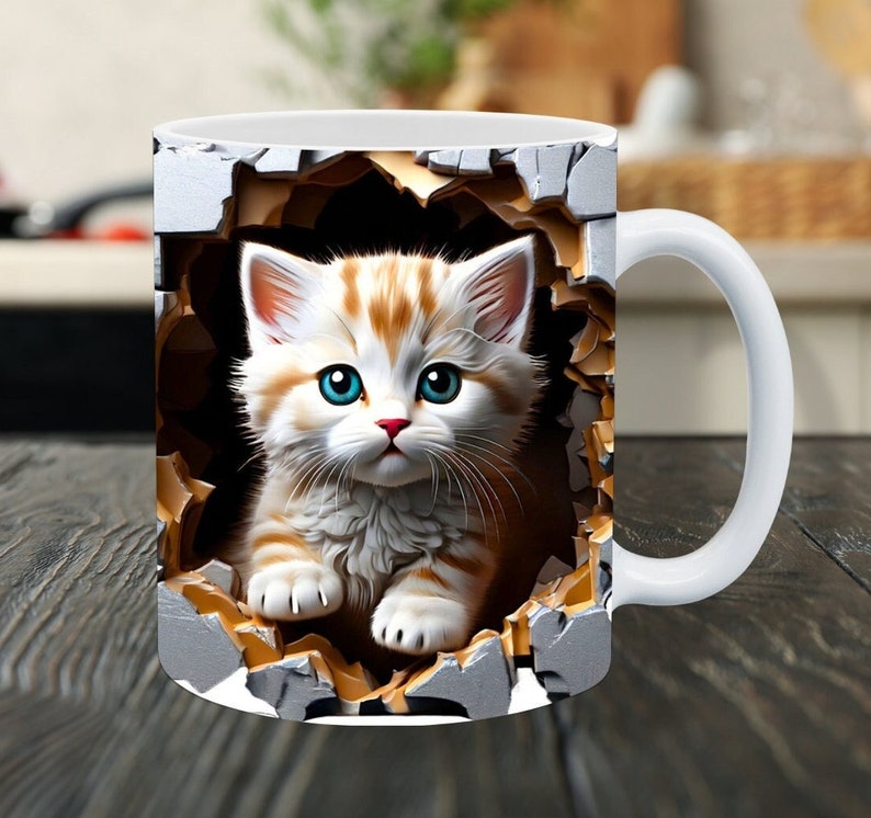 "This 3D Broken Wall Cat Mug will bring surprises to your daily life. A curious kitten seems to be peeking out of the cup, breaking the routine and adding fun to your desktop.