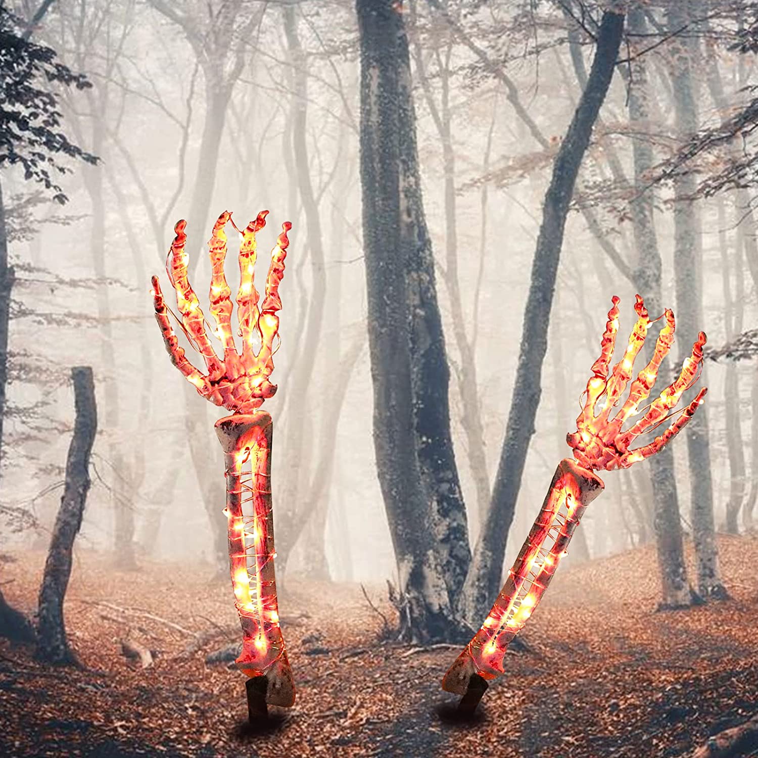 💀️【Halloween Decoration Hands Bone】The skeleton arm stakes are wrapped around with a 40 bright LED copper wire light, available to stick in anywhere you want, the vivid design adds a weird effect to your Halloween decoration, which is perfect for your Halloween party. Product Size 18.3 x 3.7 Inch.
