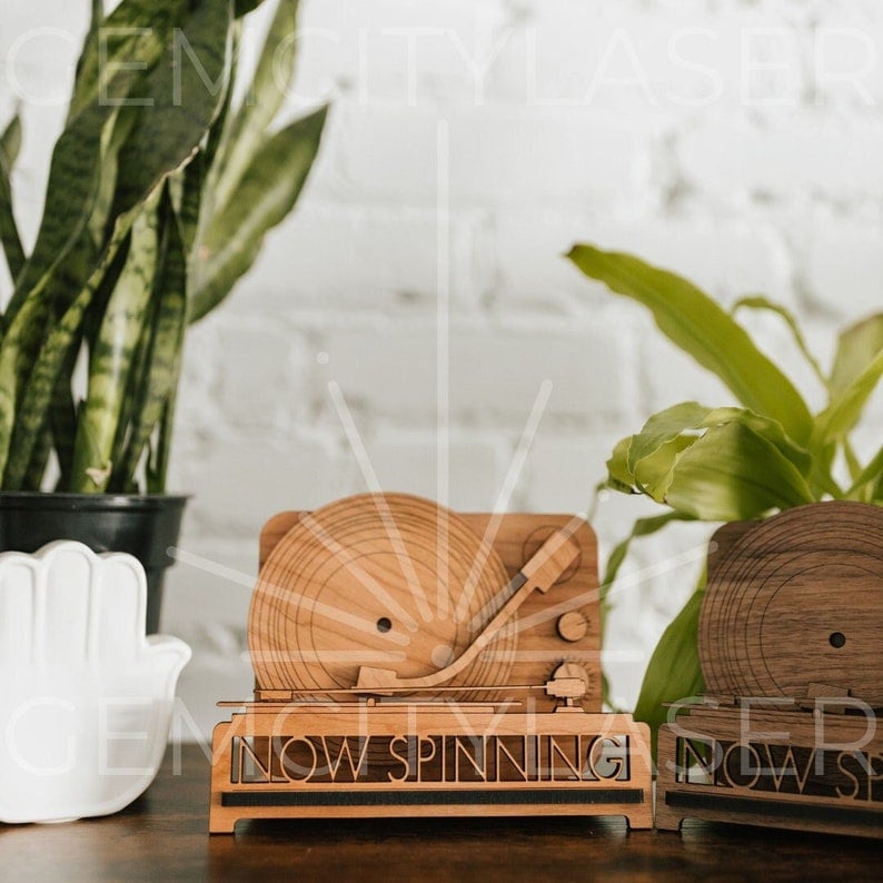 "Now Spinning" record player album display stand. Provides a decorative solution to displaying the sleeve of your currently playing or favorite album. Made of .25" thick finished plywood.