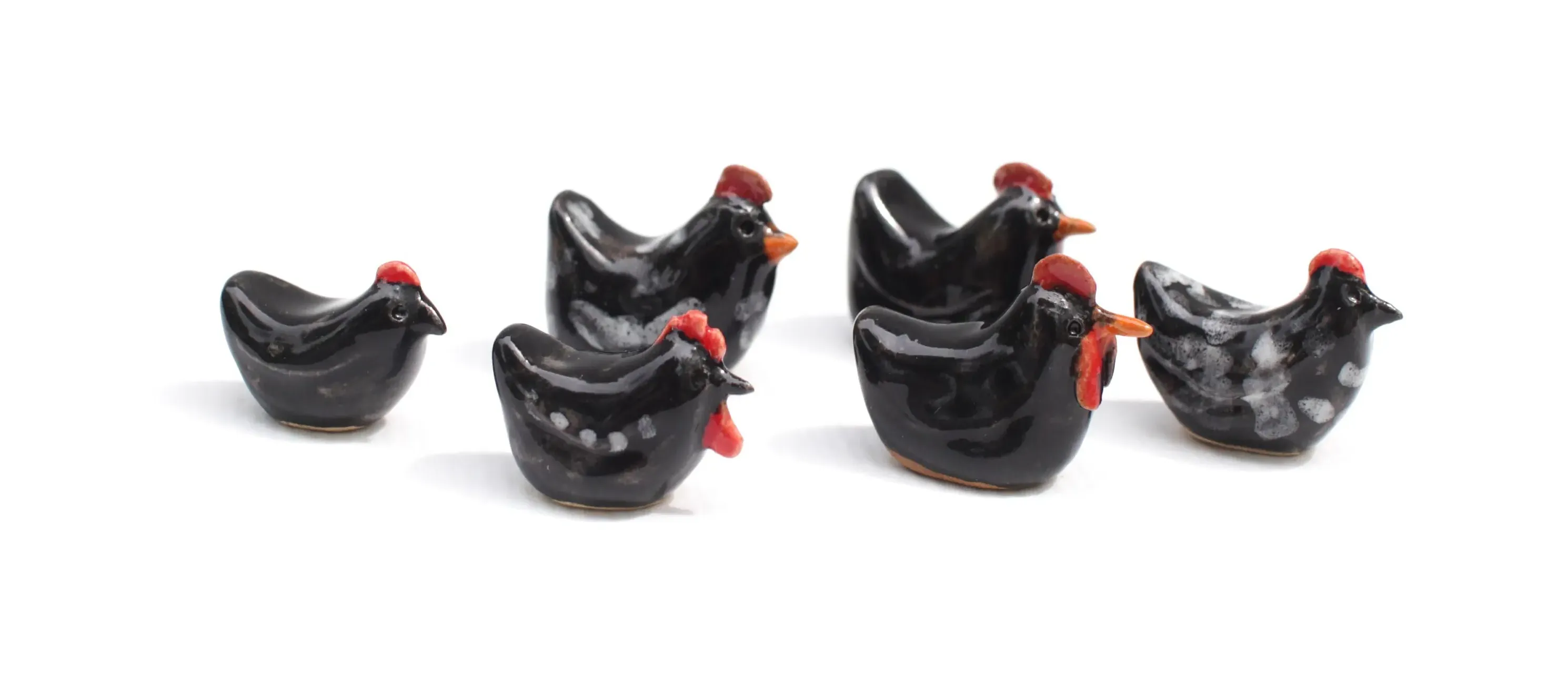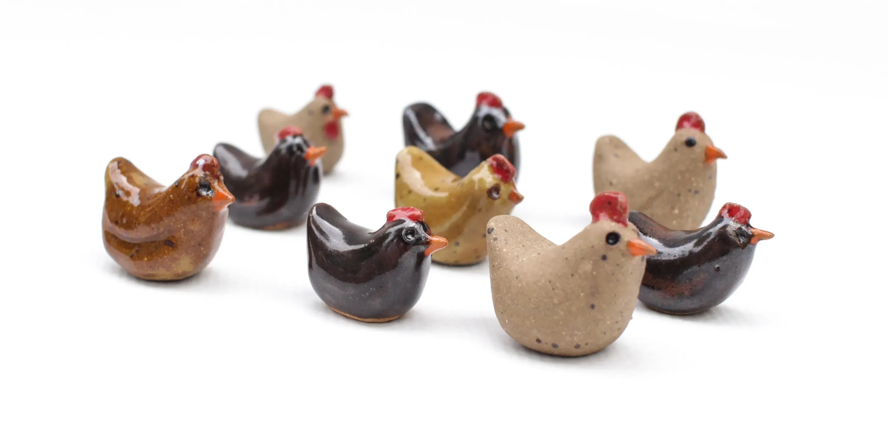 Hand sculpted and painted stoneware ceramic chicken miniatures. Perfect for bonsai, Penjing, fairy gardens, micro-landscapes, terrariums, Zen gardens and more. Your imagination is the limit for how to display and use these chickens. Perfect gift for the friend who loves tiny things.