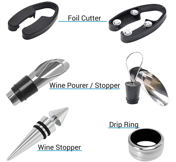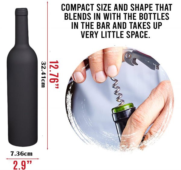 - 5-Piece Wine Accessory Gift Set: Each wine opener gift set includes 5 carefully chosen accessories: a wine corkscrew opener, wine stopper, foil cutter, wine pourer, and drip ring. These are elegantly stored inside a wine bottle-shaped case.